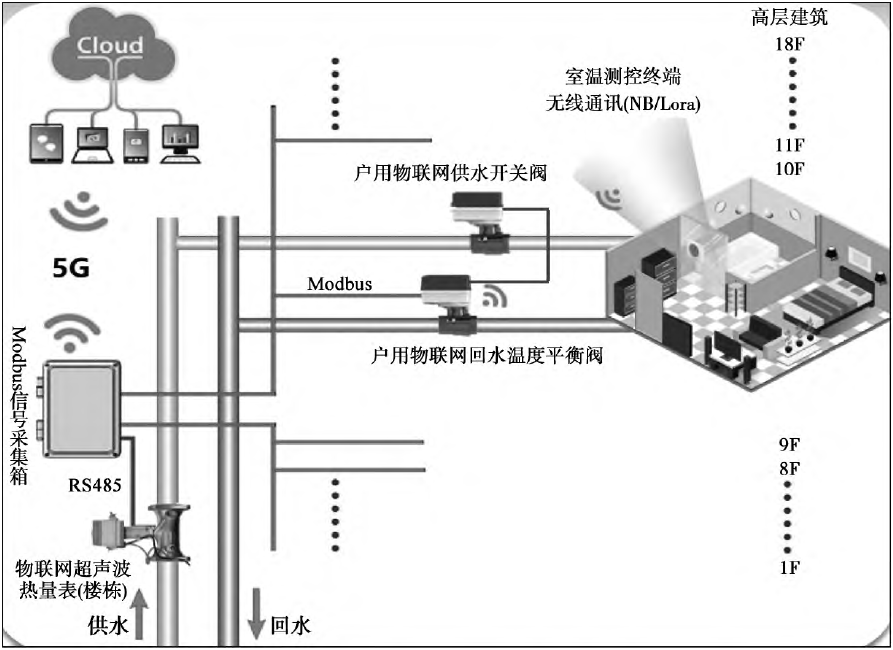 單管串聯和雙管垂直系統。公共立管在居民家中,入戶改造影響居民生活,實施難度高,改造后效果不明顯。所以改造從熱源實施到樓棟入口,即在典型住戶、典型位置安裝智能室溫采集器,樓棟/單元熱力入口設置物聯網平衡閥,實現樓棟單元間的精準調控。詳見圖3。