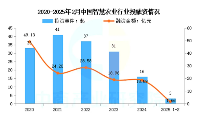 近年來(lái),中國(guó)智慧農(nóng)業(yè)行業(yè)投資事件數(shù)量及規(guī)模整體呈波動(dòng)上升趨勢(shì)。IT桔子數(shù)據(jù)顯示,2024年我國(guó)智慧農(nóng)業(yè)投資數(shù)量16起,已披露融資金額達(dá)18.59億元。2025年1-2月我國(guó)智慧農(nóng)業(yè)投資數(shù)量3起,已披露融資金額達(dá)1.66億元。